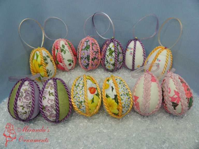 Cute Easter eggs about 6 cm ( 2.5 inch) high. With hand-dyed cord and ribbon.